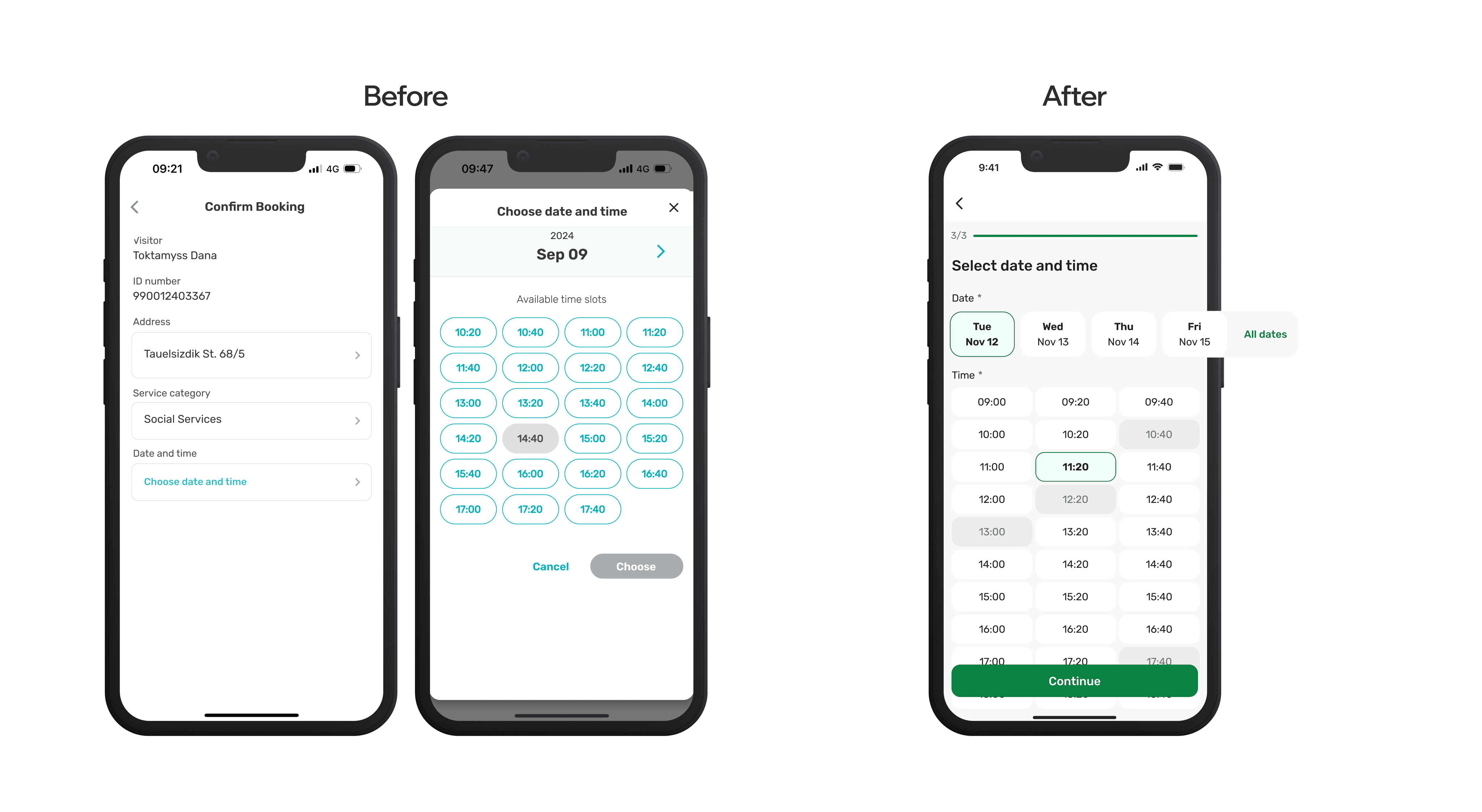 The next problem appeared on the “Confirm Booking” screen. After choosing a service, users were unexpectedly directed to a page where they had to manually tap “Choose date and time.” This broke the flow and was unclear. I replaced this step with a new screen that directly shows available dates and times.