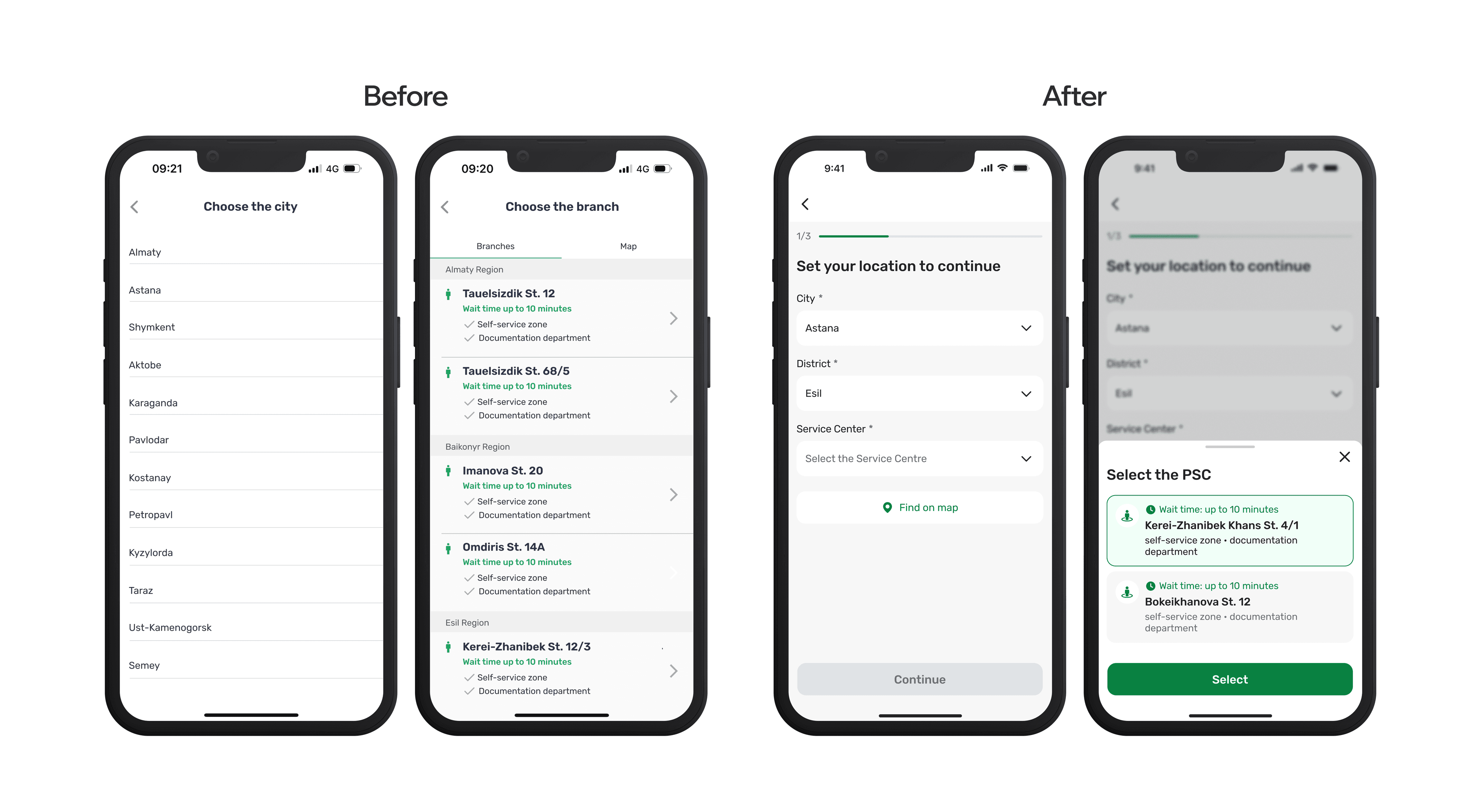 This case study explores how I enhanced Kazakhstan's PSC government services app by completely redesigning its booking flow. Facing critical usability issues and working with tight constraints, 2 weeks and no research budget, I delivered a streamlined solution that transformed a confusing, multi-step process into an intuitive experience with clear navigation, visual hierarchy, and supportive elements.