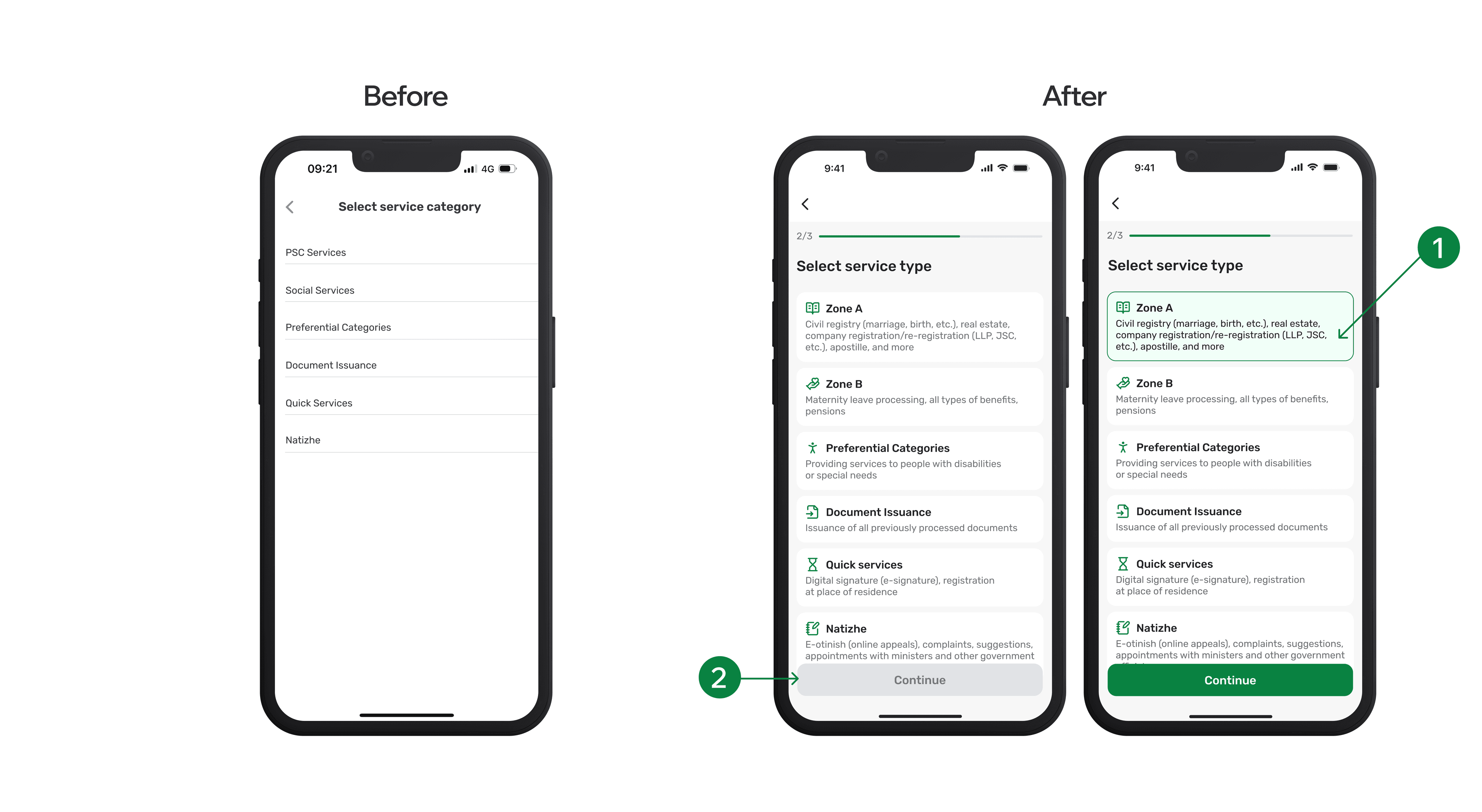 To reduce errors, the “Continue” button remains inactive until a service type is selected, helping users stay on track.